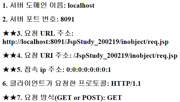 1234567891011121314151617181920212223242526272829303132<%@ page language="java" contentType="text/html; charset=UTF-8"pageEncoding="UTF-8"%><!DOCTYPE html><html><head><meta charset="UTF-8"><title>Insert title here</title></head><body><h2>1. 서버 도메인 이름:<%=request.getServerName()%></h2><h2>2. 서버 포트 번호:<%=request.getServerPort()%></h2><h2>★★3. 요청 URL 주소:<%=request.getRequestURL()%></h2><h2>★★4. 요청 URI 주소:<%=request.getRequestURI()%></h2><h2>★★5. 접속 ip 주소:<%=request.getRemoteAddr()%></h2><h2>6. 클라이언트가 요청한 프로토콜:<%=request.getProtocol()%></h2><h2>★★7. 요청 방식(GET or POST):<%=request.getMethod()%></h2></body></html>http://colorscripter.com/info#e" target="_blank" style="color:#4f4f4ftext-decoration:none">Colored by Color Scripter