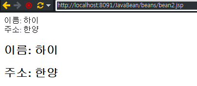 BeanDTO 자바빈 클래스의 객체를 생성하고 Setter, Getter 메소드를 호출하는 JSP 페이지