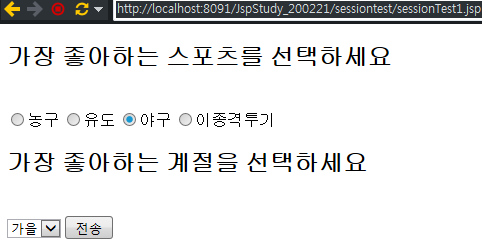 session 속성을 설정하고 form에 좋아하는 스포츠와 계절을 입력받는 페이지