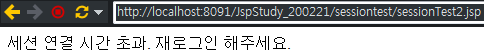 sessionTest1.jsp 에 입력한 데이터 출력<%@ page language="java" contentType="text/html; charset=UTF-8" pageEncoding="UTF-8"%> <!DOCTYPE html PUBLIC "-//W3C//DTD HTML 4.01 Transitional//EN" "http://www.w3.org/TR/html4/loose.dtd"> <html> <head> <meta http-equiv="Content-Type" content="text/html; charset=UTF-8"> <title>세션 유지, 세션 정보 출력</title> </head> <body> <% request.setCharacterEncoding("utf-8"); String sports = request.getParameter("sports"); String season = request.getParameter("season"); // 세션 정보 가져오기 // idKey 속성명에 해당하는 속성값 반환 String id = (String) session.getAttribute("idKey"); // 세션 고유 id 반환 String sessionId = session.getId(); // 세션 유지 시간 반환 int interval = session.getMaxInactiveInterval(); // id 값이 있는 경우 출력 if (id != null) { %> <b><%=id%></b>님이 좋아하는 스포츠와 계절은? <br /> <b><%=sports%>와 <%=season%>입니다.</b> <br /> 세션 id:<%=sessionId%> <br /> 세션 유지 시간: <%=interval%> <% // 출력 후 세션 연결 해제 session.invalidate(); } else { // id가 null인 경우 out.println("세션 연결 시간 초과. 재로그인 해주세요."); } %> </body> </html>