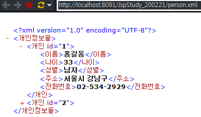 <?xml version="1.0" encoding="UTF-8"?> <개인정보들> <개인 id="1"> <이름>홍길동</이름> <나이>33</나이> <성별>남자</성별> <주소>서울시 강남구</주소> <전화번호>02-534-2929</전화번호> </개인> <개인 id="2"> <이름>이순신</이름> <나이>37</나이> <성별>남자</성별> <주소>경상남도</주소> <전화번호>010-5858-2929</전화번호> </개인> </개인정보들>