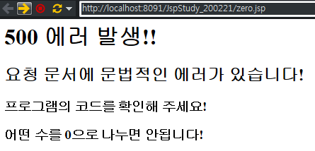 zero.jsp 페이지 실행 시 출력되는 에러 페이지