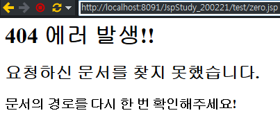URI의 zero.jsp 앞에 test/ 추가 시 출력되는 에러 페이지