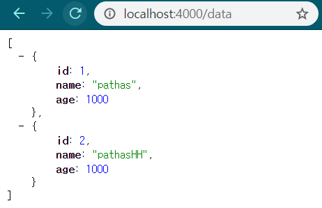http://localhost:4000/data 접속 시 다음과 같이 json 형식의 데이터 확인 가능